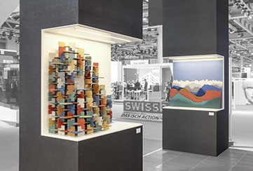 Der spielerische Umgang mit Material, Palette und Verarbeitung lädt zum Entdecken ein, generiert Aufmerksamkeit und schafft spannende Kontraste zur Architektur des Messestands.